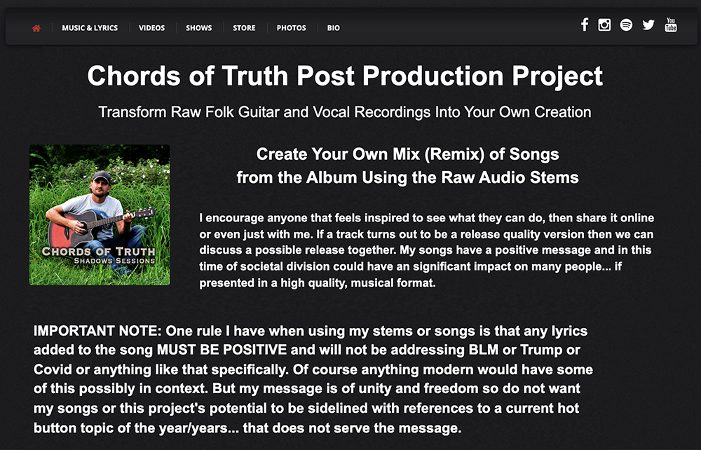 IMPORTANT NOTE: One rule I have when using my stems or songs is that any lyrics added to the song MUST BE POSITIVE and will not focus on current hot button topics of the year(s). Of course anything modern would have some of this possibly in context. But my message is of unity and freedom so do not want my songs or this project's potential to be sidelined by unhelpful divisive references... that do not serve the message.